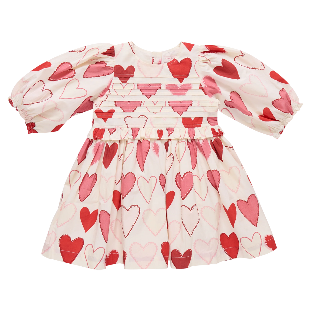 A brand-new silhouette we’re completely smitten with! The Renee Dress features dreamy gradient hearts, soft puff sleeves with elastic, delicate front pleats at the bodice, and charming ruffle details at the sleeves and waist. Finished with shimmering pink glitter buttons, this twirl-worthy style feels playful yet polished. Match with baby sis in the Renee Dress Set for a love-filled Valentine’s Day moment.