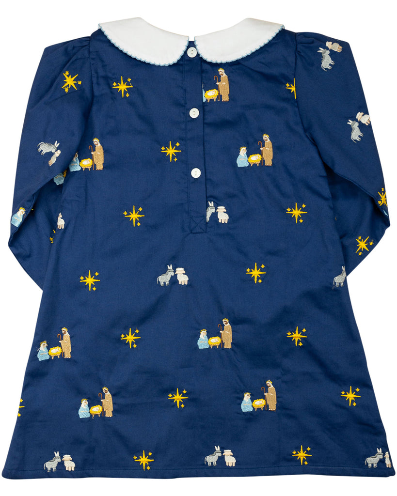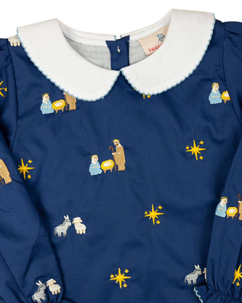 A holiday classic, our Nativity Embroidered Navy Dress captures the beauty of the season with its intricate embroidered Nativity design. Featuring a traditional silhouette, long sleeves, and a delicate white-trimmed collar, this dress is perfect for festive occasions and special moments. Pair with matching sibling outfits for a heartwarming family look!