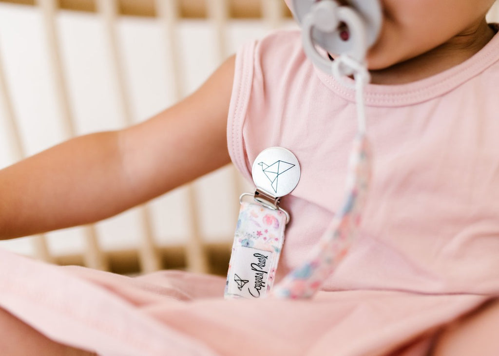 Offering the ultimate blend of fashion and function, our unique Binky Clip features a premium knit strap lined with absorbent fleece to help soak up drool. Simply attach baby's pacifier or teether to one end, then fasten the clip to clothing, blankets or baby gear. Oh, and by the way our set includes three Binky Clips to keep with you wherever you go - no more floor drops or pacifier pick-ups!