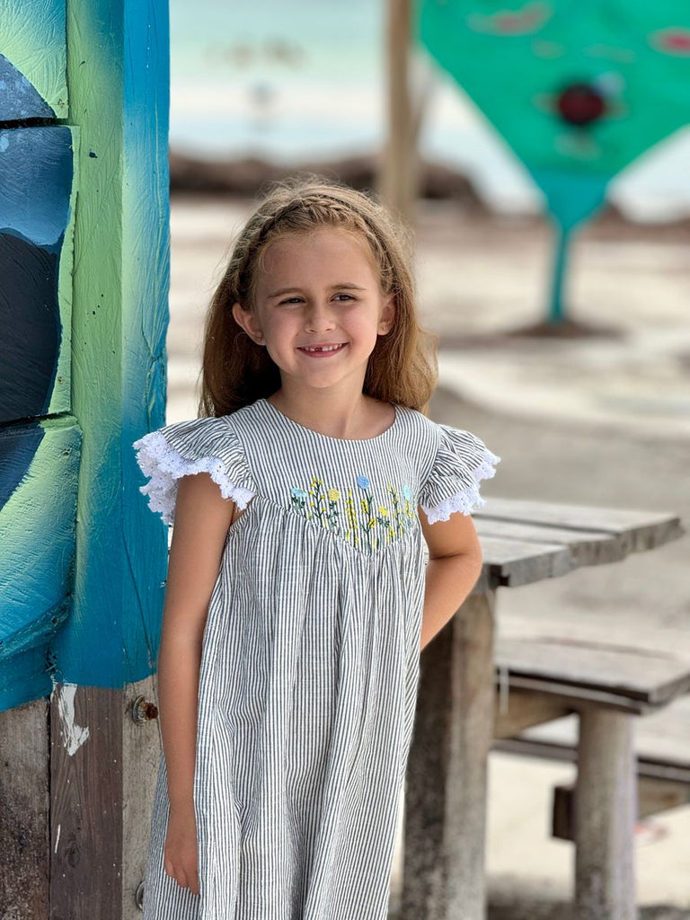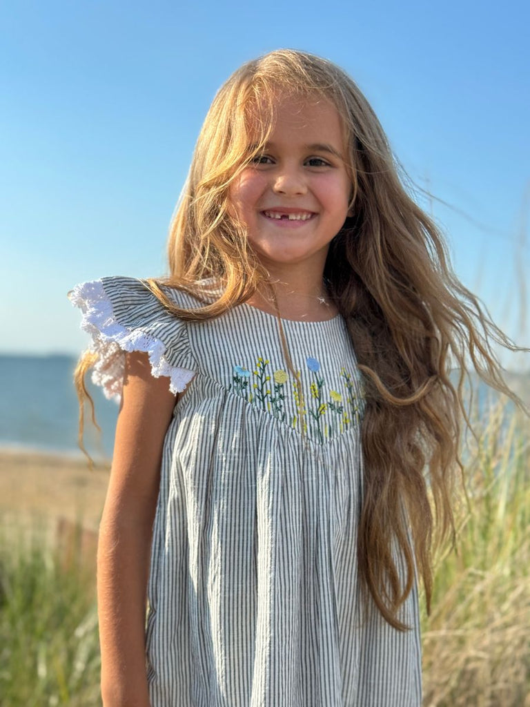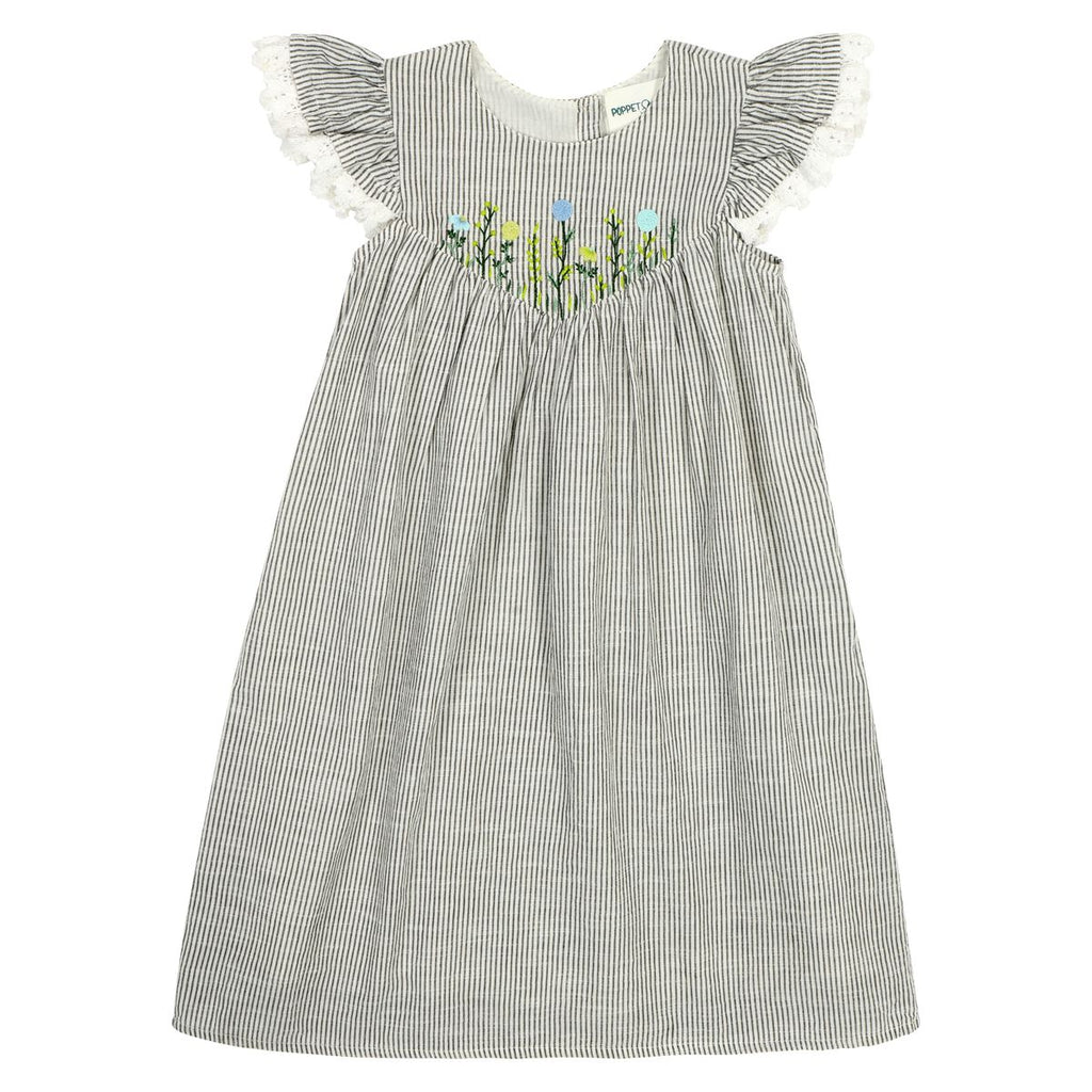 Classic yet modern, this dress boasts beautiful detailed embroidery on the bib and delicate cap sleeves with lace edging. The traditional style gets a sophisticated upgrade, making it the perfect addition to her wardrobe. Elevate her fashion game with this elegant twist on a timeless classic.