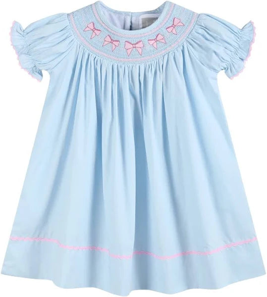 This Blue and Pink Bow Smocked Bishop Dress is a timeless choice for your little girl. The smocked neckline is adorned with delicate embroidered pink bows, complemented by pretty pink rickrack trim details. Designed in the classic bishop length, it gracefully falls to mid-calf/ankles, offering an elegant silhouette. Perfect for special occasions or everyday wear, this dress exudes sweetness and charm.