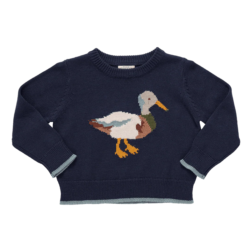 Dapper Duck! A handsome Mallard, set against a navy ground, stands ready for a fast-paced game of Duck,Duck,Goose on our Boys Oliver Sweater. This roomy layer is tipped with a teal accent at the sleeve and bottom hem. Pairs perfectly with our Boys Jackson Pant with Mallard embroidery for a finished look.
