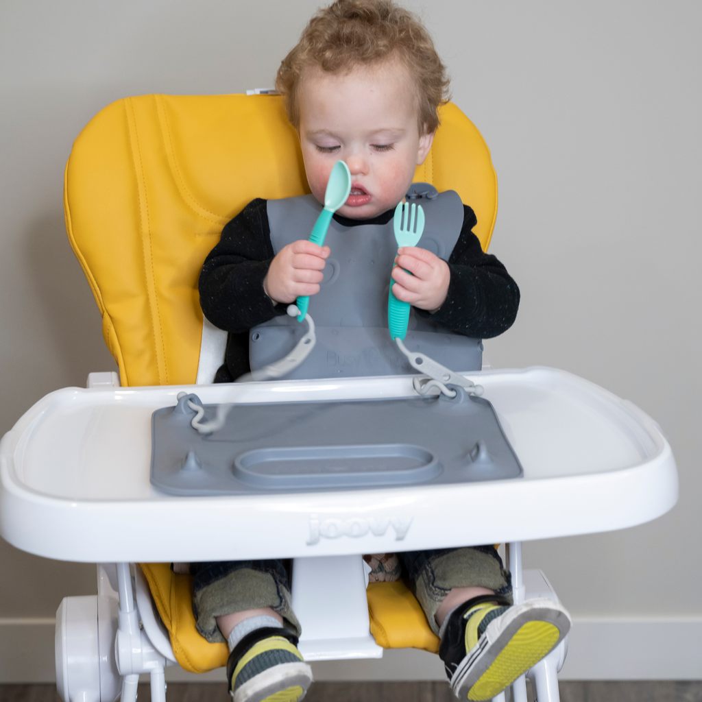 Set an extra setting, someone new is joining us for dinner! The Busy Baby Utensils Set is designed just right for little hands, promoting their feeding independence! Specifically designed to attach to the Busy Baby Tethers on our Mats or Bibs to keep them within their reach and off the floor!