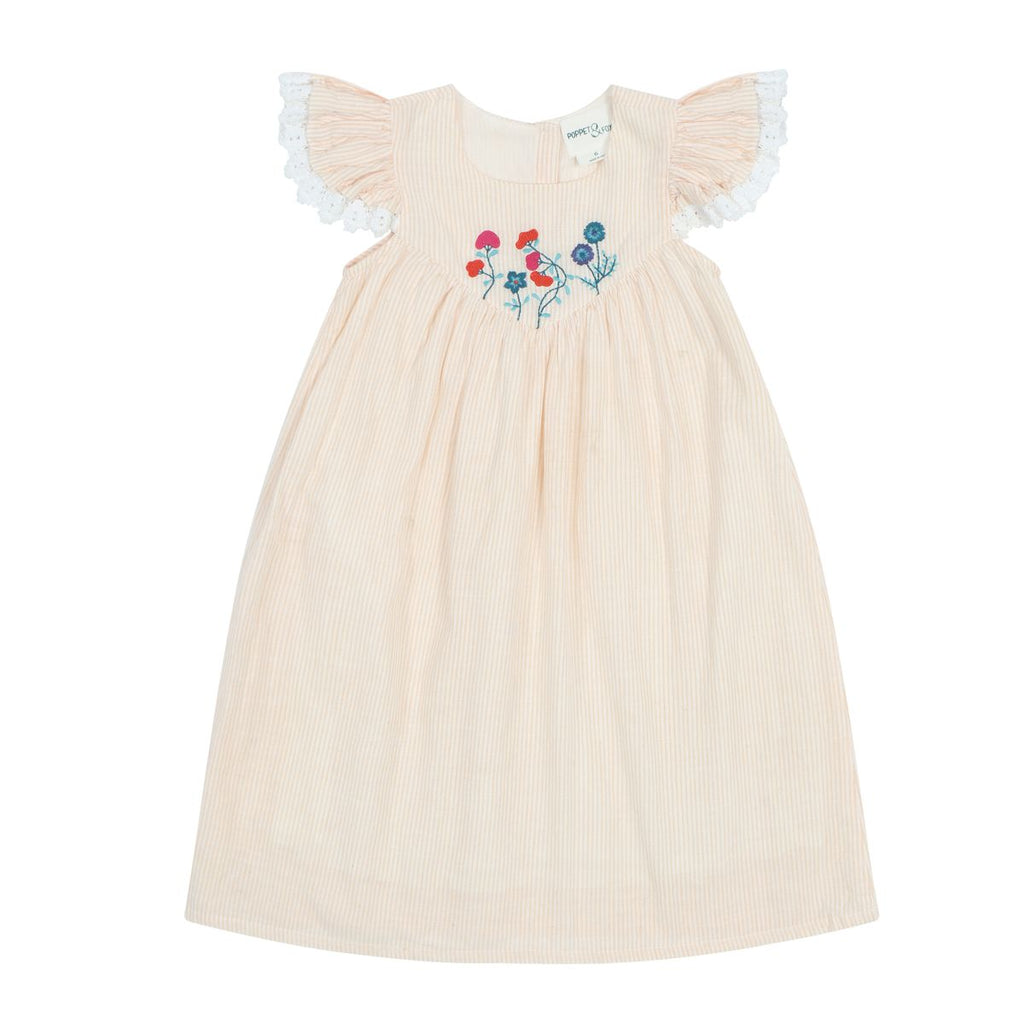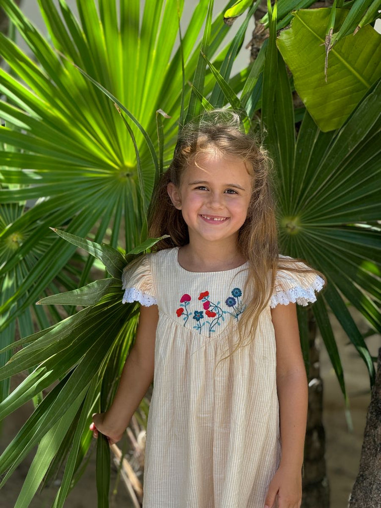 Classic yet modern, this dress boasts beautiful detailed embroidery on the bib and delicate cap sleeves with lace edge. The traditional style gets a sophisticated upgrade, making it the perfect addition to her wardrobe. Elevate her fashion game with this elegant twist on a timeless piece.