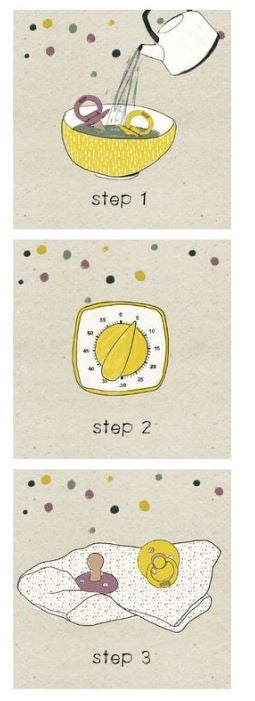 Sterilize each pacifier before use. Bring water to a boil and pour boiling water over pacifiers. Let the pacifiers soak for approx. 5 minutes. Pick them up and let them dry. The pacifier nipples may retain water, simply squeeze the nipple to release and lay to cool and dry for 3-4 hours. If the pacifier shows any irregularities, we recommend that you discard right away. Due to our pacifiers being made with natural rubber, the nipple may expand with use.