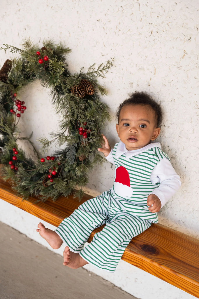 Crafted from soft, breathable cotton, the Jack Longall Santa Hat Romper features a festive Santa hat appliqué over a classic striped pattern. Designed for all-day comfort and easy sibling matching, it pairs perfectly with our big brother two-piece Santa Hat pant set. Wear it alone or layer it with our Hart Onesie underneath for added coziness. Snaps at the seat make diaper changes quick and easy.