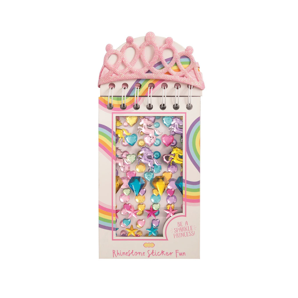 2-piece set. Dress-up rhinestone sticker sheets come with stretchy crown. Sticky gems may also be used as face jewels. Ages 3+.