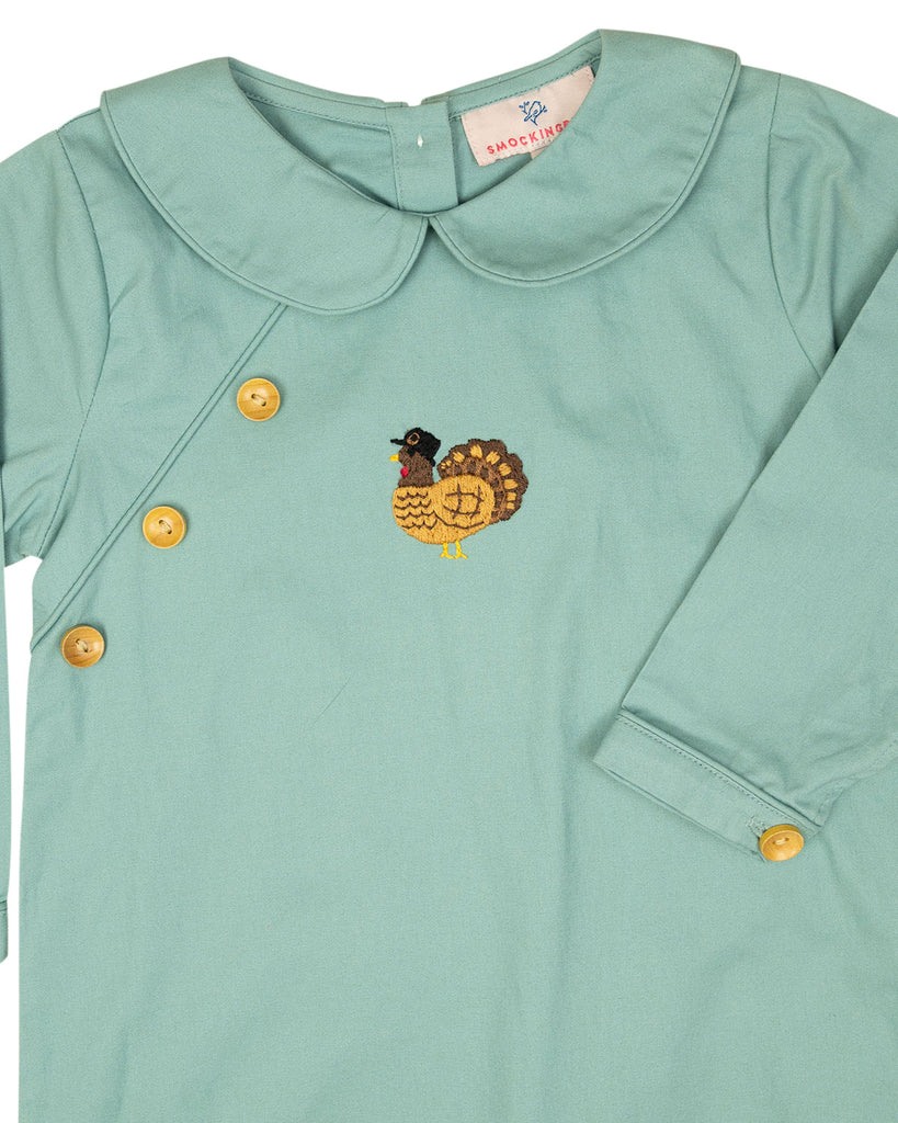 Sage green longall with small wooden buttons at the end of sleeve. Adorable Hand embroidered turkey on the center of the chest. Metal snaps in stride and made fully lined—perfect addition for a little boy running around this Thanksgiving. Add a monogram straight across chest or name in vintage cursive on collar.